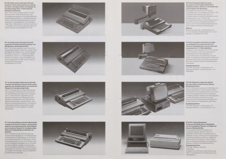 Faltprospekt für elektronische Standard-Schreibmaschinen und Bildschirmschreibmaschinen Olivetti Nr. 03/038/ET-TV/3.86