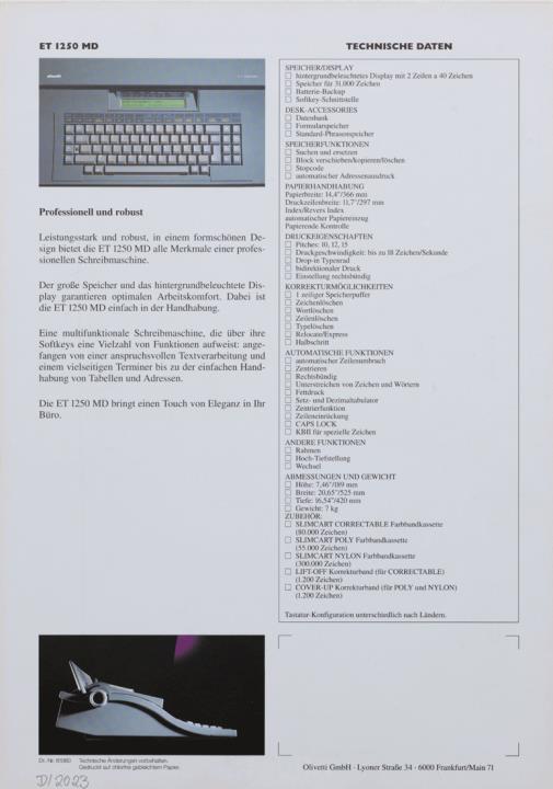 Prospekt für elektronische Schreibmaschine Olivetti ET 1250 MD Nr. 61080