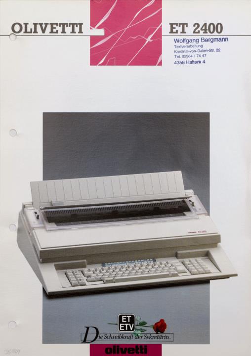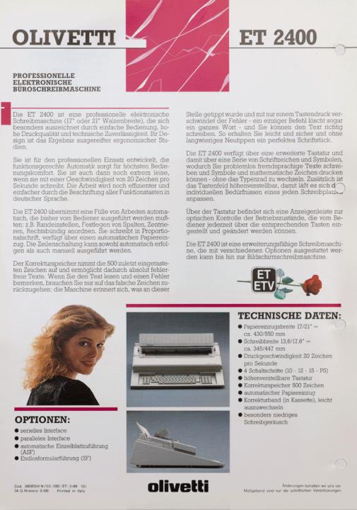 Prospekt für elektronische Schreibmaschine Olivetti ET 2400 Die Schreibkraft der Sekretärin Nr. 3908504 N/03/082/ET/3-88 (D)