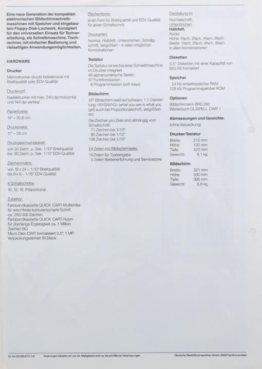 Prospekt für elektronische Bildschirmschreibmaschine Olivetti CWP 1 Nr. 03/088/ETV/1.91