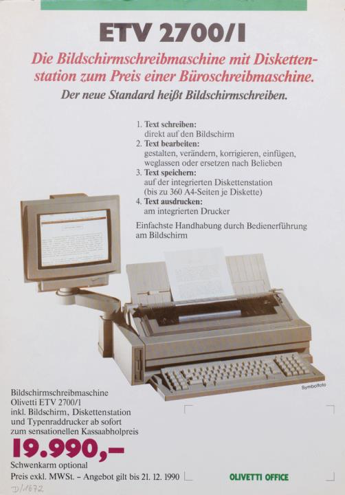 Prospekt für elektronische Schreibmaschine Olivetti ETV 2700/I Die Bildschirmschreibmaschine mit Diskettenstation zum Preis einer Büroschreibmaschine