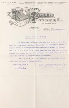 Brief (Bescheinigung) der Smith Premier Typewriter Co., Berlin datiert 02.02.1904 Maschinenschrift, unterschrieben; Brief-Doppelbogen mit Wasserzeichen "Greentowns Linen Bank"