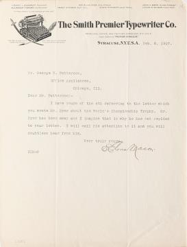 Brief der Smith Premier Typewriter Co., Syracuse; datiert 06.02.1907 Maschinenschrift, unterschrieben; Briefbogen mit Wasserzeichen "Smith Premier"