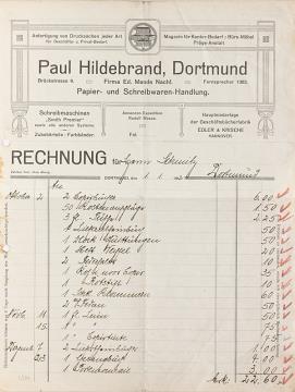 Rechung der Bürowarenhandlung Paul Hildebrand, Dortmund adressiert an Herrn Schmitz, Dortmund; datiert 06.02.1907 Handschrift