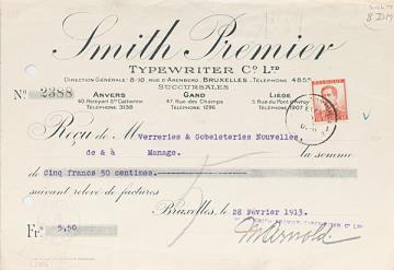 Quittung Nr. 2388 der Smith Premier Typewriter Co., Brüssel datiert 28.02.1913; ausgestellt auf Verreries & Gobeleteries Nouvelles, Manage über Francs 5.50 Maschinenschrift, Unterschriftstempel; mit Gebührenmarke