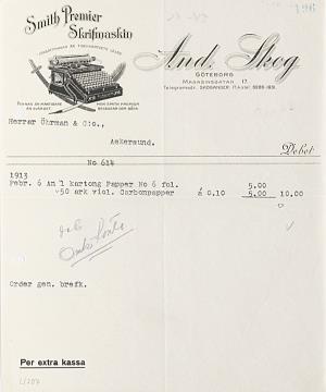 Lieferschein Nr. 614 der Schreibmaschinenhandlung And. Skog, Göteborg adressiert an Herrar Öhrman & Co., Askersund, datiert Febr. 1913 Maschinenschrift, unterschrieben