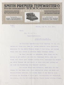 Brief der Smith Premier Typewriter Co., Zürich adressiert an Herrn Zopfi, Schwanden; datiert 28.07.1914 Maschinenschrift, unterschrieben; Briefbogen mit Wasserzeichen "Smith Premier"
