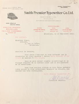 Brief der Smith Premier Typewriter Co., Brüssel adressiert an Monsieur Claes, Bruxelles; datiert 10.09.1915 Maschinenschrift, unterschrieben; Briefbogen mit Wasserzeichen "Smith Premier"