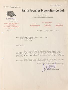 Brief der Smith Premier Typewriter Co., Brüssel adressiert an Messieurs Roisin - Ses Fils & Cie, Chatelet; datiert 04.04.1919 Maschinenschrift, unterschrieben; Briefbogen mit Wasserzeichen "Smith Premier"