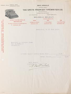 Verkaufsbeleg der Smith Premier Typewriter Co., Brüssel adressiert an Monsieur Claes, Bruxelles; datiert 11.06.1913 Maschinenschrift, unterschrieben
