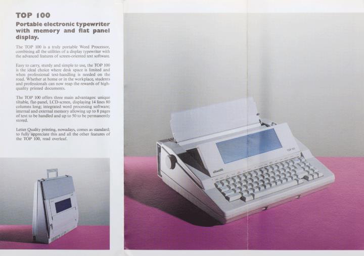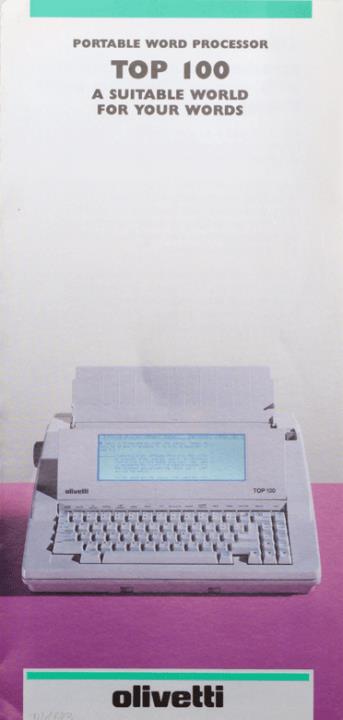Faltprospekt für tragbare elektronische Speicherschreibmaschine Olivetti TOP 100 A suitable world for your words Nr. 0131930F-00 (03-90)
