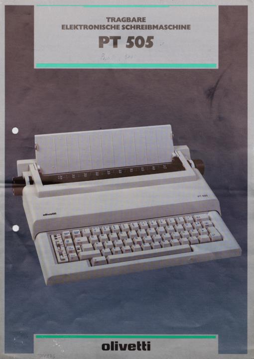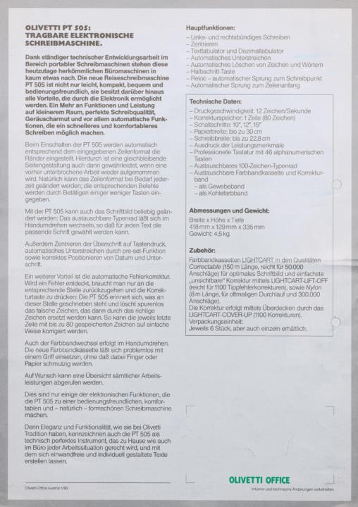 Prospekt für tragbare elektronische Schreibmaschine Olivetti PT 505 Nr. 1/90