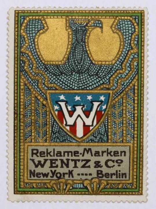 Werbemarke für Reklamemarkenvertrieb Wentz & Co Motiv: stilisierter deutscher Adler und US-Wappen mit Buchstaben W rechteckig, polychrom