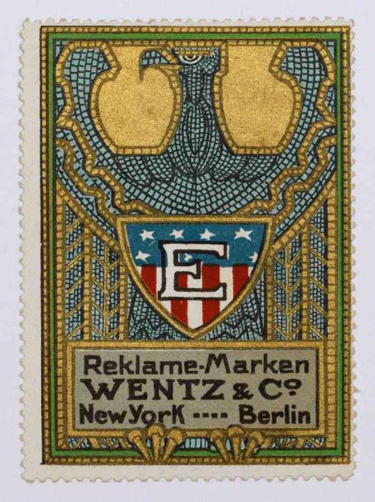 Werbemarke für Reklamemarkenvertrieb Wentz & Co Motiv: stilisierter deutscher Adler und US-Wappen mit Buchstaben E rechteckig, polychrom