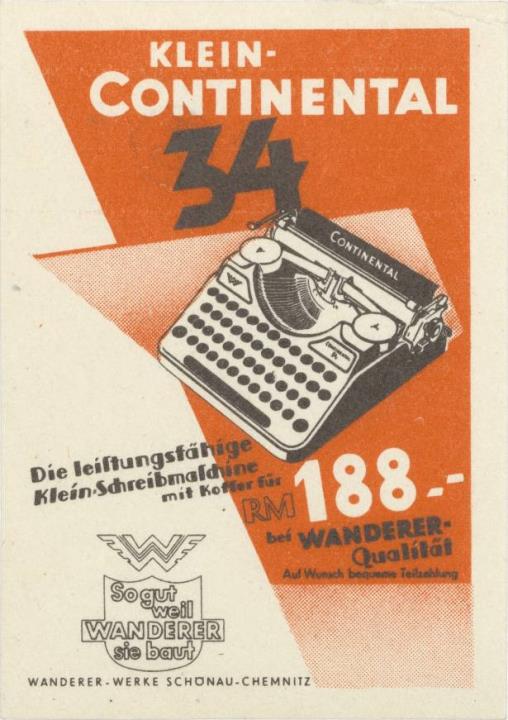 Reklamemarke/Werbemarke für Schreibmaschine Continental; rechteckig, polychrom Text: Die leistungsfähige Klein-Schreibmaschine mit Koffer für RM 188.-