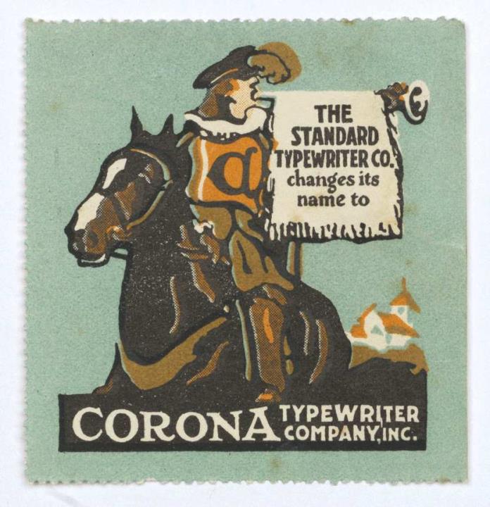 Reklamemarke/Werbemarke für Schreibmaschine Corona; rechteckig, polychrom Text: The Standard Typewriter Co. changes its name to Conrona Typewriter Company, Inc.