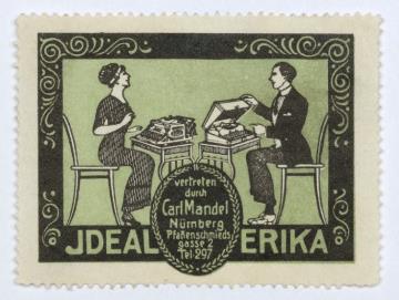 Reklamemarke/Werbemarke für Schreibmaschinen Ideal und Erika; rechteckig, polychrom Text: vertreten durch Carl Mandel Nürnberg Pfannenschmiedsgasse 2 Tel. 297