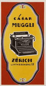 Reklamemarke/Werbemarke für Schreibmaschinenhandlung Muggli; rechteckig, polychrom Motiv: Schreibmaschine L. C. Smith