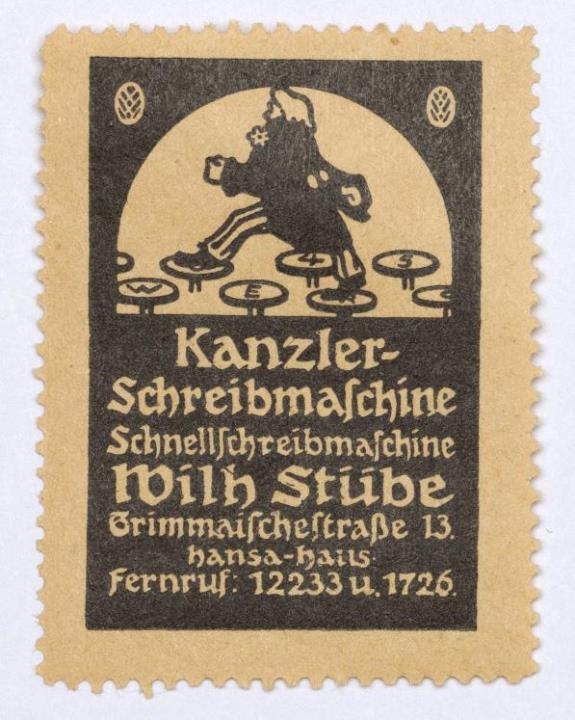 Reklamemarke/Werbemarke für Schreibmaschine Kanzler; rechteckig, monochrom weiterer Text: Schnellschreibmaschine Wilh Stübe Grimmaischestraße 13