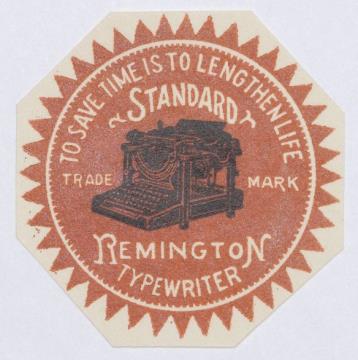 Siegelmarke für Schreibmaschine Remington; achteckig, polychrom Text: To save time is to lenghten life