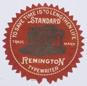 Siegelmarke für Schreibmaschine Remington; rund, polychrom Text: To save time is to lenghten life
