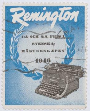 Reklamemarke/Werbemarke für Schreibmaschine Remington; rechteckig, polychrom Text: 1:A Och 2:A Pris I Svenska Mästerkapen 1946