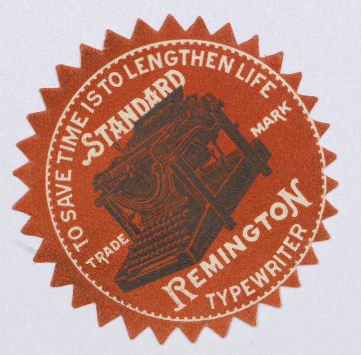 Siegelmarke für Schreibmaschine Remington; rund, polychrom Text: To save time is to lenghten life