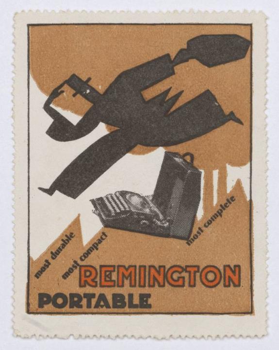 Reklamemarke/Werbemarke für Schreibmaschine Remington; rechteckig, polychrom Text: most durable most compact most complete