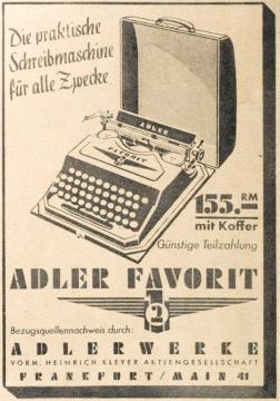 Werbeanzeige für Schreibmaschine Adler Favorit monochrom