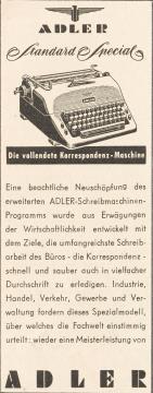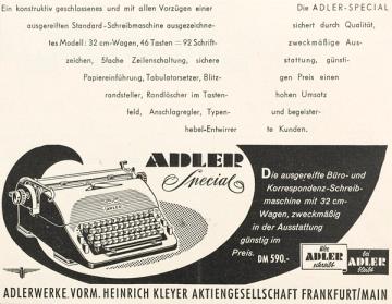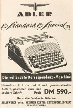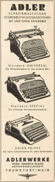 Werbeanzeige für Schreibmaschinen Adler Universal, Special, Privat monochrom