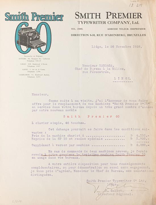 Brief der Smith Premier Typewriter Co., Liége adressiert an Monsieur Mardaga, Liége; datiert 26.11.1928 Maschinenschrift, unterschrieben