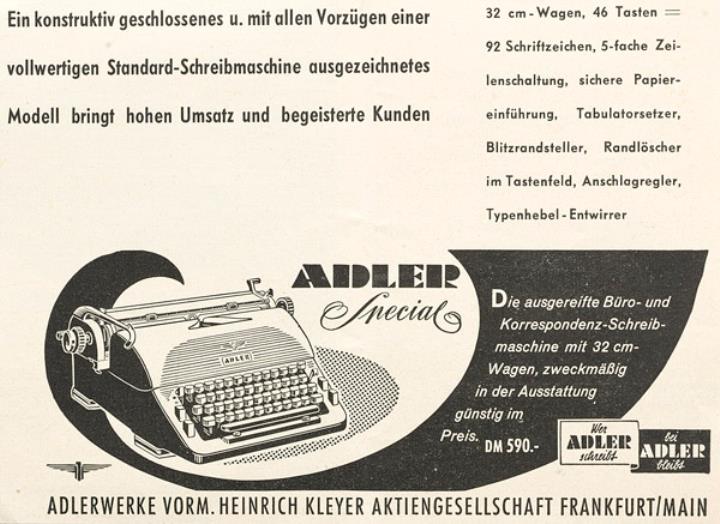 Werbeanzeige für Schreibmaschine Adler Special monochrom