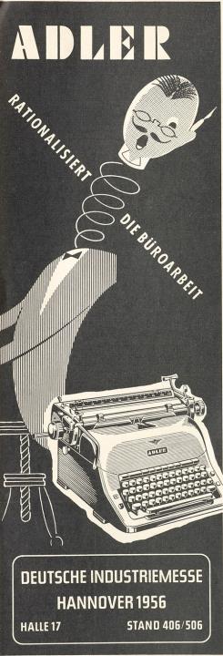 Werbeanzeige für Schreibmaschine Adler Deutsche Industriemesse Hannover 1956 monochrom
