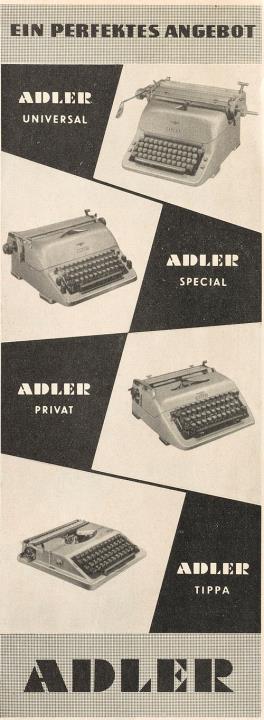 Werbeanzeige für Schreibmaschine Adler Universal, Special, Privat, Tippa monochrom