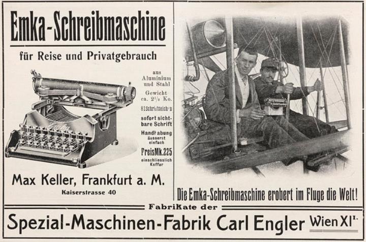 Werbeanzeige für Schreibmaschine Emka (Albus) Spezial-Maschinen-Fabrik Carl Engler Wien XI monochrom