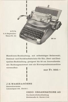 Werbeanzeige für Schreibmaschine Alpina BSS 33 J. H. Waser & Söhne Generalvertreter monochrom
