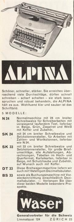 Werbeanzeige für Schreibmaschine Alpina Waser Generalvertretung für die Schweiz monochrom