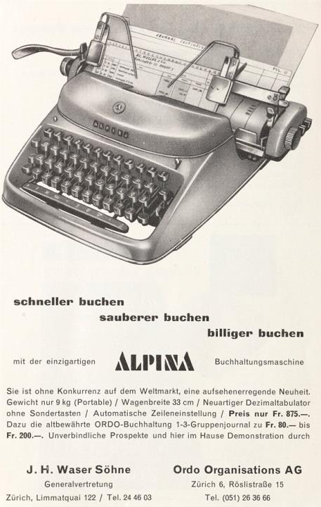 Werbeanzeige für Schreibmaschine Alpina J. H. Waser Söhne Generalvertretung monochrom