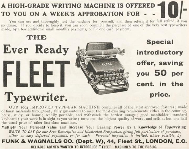 Werbeanzeige für Schreibmaschine Fleet monochrom