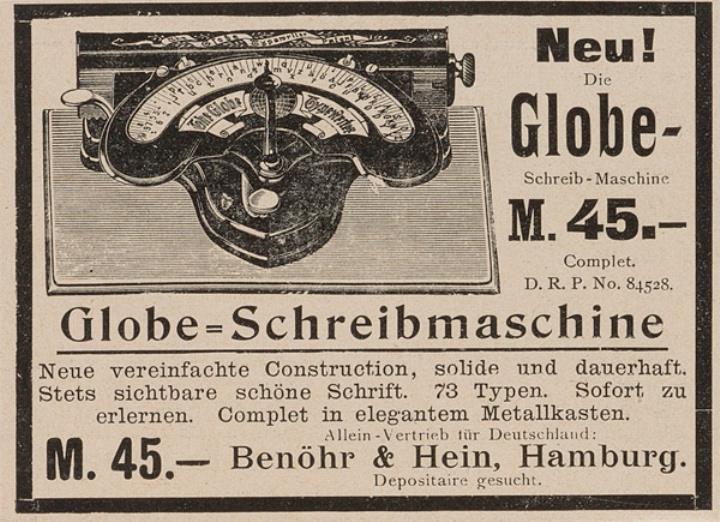 Werbeanzeige für Indexschreibmaschine Globe (American) Allein-Vertrieb für Deutschland: Benöhr & Hein, Hamburg monochrom