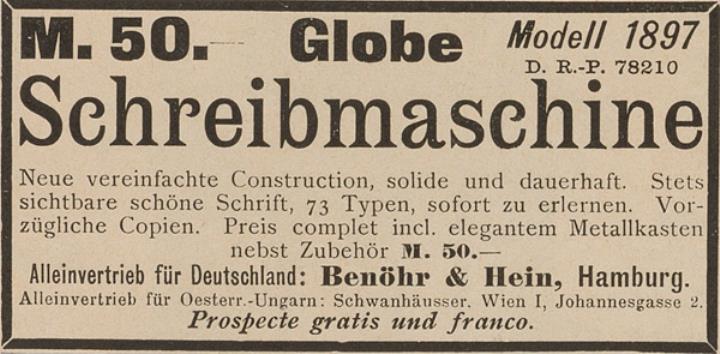 Werbeanzeige für Indexschreibmaschine Globe (American) Allein-Vertrieb für Deutschland: Benöhr & Hein, Hamburg monochrom