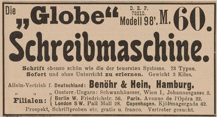Werbeanzeige für Indexschreibmaschine Globe (American) Allein-Vertrieb für Deutschland: Benöhr & Hein, Hamburg monochrom