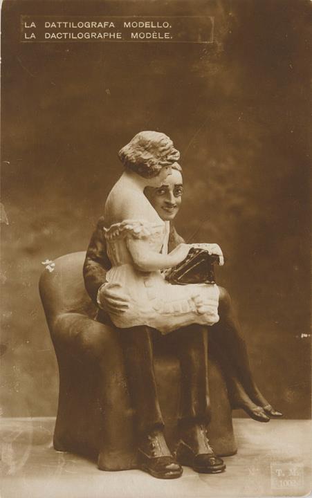 Illustrierte Postkarte; Fotografie, monochrom; T.M. 1002 Rückseite: Keramikfigur; Frau/Sekretärin mit Schreibmaschine auf Schoß des Mannes/Chefs sitzend Vorderseite beschrieben