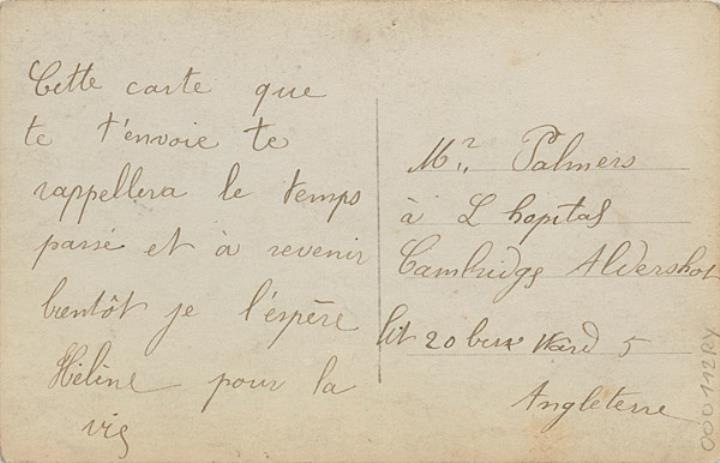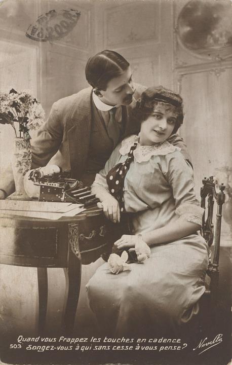Illustrierte Postkarte; Fotografie, koloriert; Serie Novelta 503 Rückseite: Vorgesetzter/Mitarbeiter und Sekretärin in romantischer Büroszene, Text in Versform; Stempelfragment Vorderseite: beschrieben; adressiert an Mr. Palmers, Cambridge