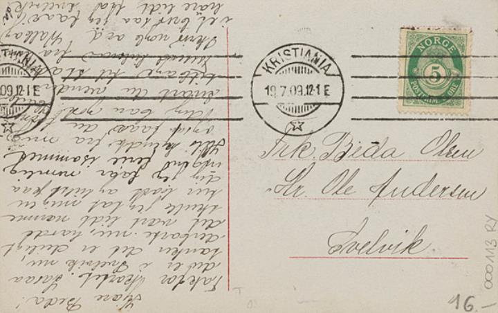 Illustrierte Postkarte; Fotografie, monochrom; Serie RPH 1895/6 Rückseite: Vorgesetzter/Mitarbeiter und Sekretärin mit Schreibmaschine in romantischer Büroszene Vorderseite: beschrieben und adressiert; Briefmarke Norge Postfrim. 5 Øre; Poststempel Kristiania/19.7.1909