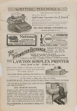 zwei Zeitschriftenblätter mit Werbeanzeigen für Schreibmaschine Caligraph 4, Daugherty Visible, Columbia Bar-Lock, Remington 6, Densmore, Smith Premier 2 und Kopiergerät Edison Mimeograph monochrom Jahreszahl handschriftlich vermerkt
