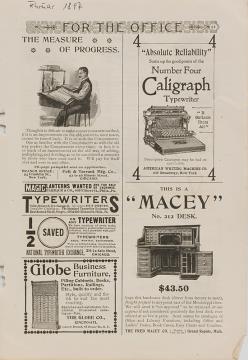 Next to literature on the history of technology, of the typewriter and the office, the Archive holds patent letters, textbooks and instruction manuals as well as historical postcards, letters, photographs and various kinds of advertising (leaflets and brochures, advertising stamps, newspaper ads, posters and signs, promotional gifts).