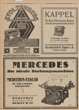 Zeitungsblatt mit Werbeanzeigen für Schreibmaschine Stolzenberg Fortuna, Kappel und Mercedes Euklid monochrom Jahreszahl handschriftlich vermerkt