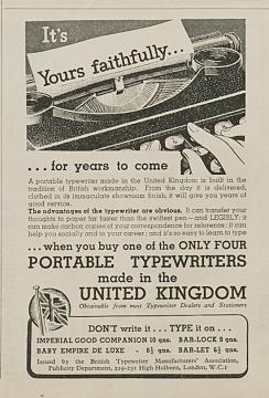 Zeitungsblatt mit Werbeanzeige der Vereinigung Britischer Schreibmaschinenhersteller monochrom