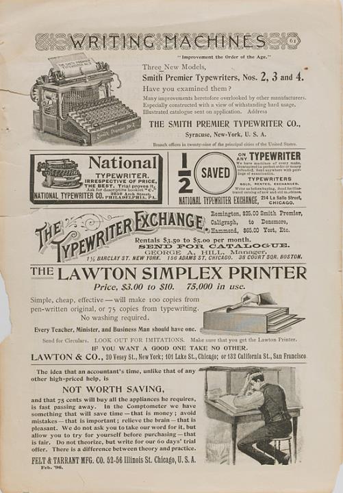 Next to literature on the history of technology, of the typewriter and the office, the Archive holds patent letters, textbooks and instruction manuals as well as historical postcards, letters, photographs and various kinds of advertising (leaflets and brochures, advertising stamps, newspaper ads, posters and signs, promotional gifts).